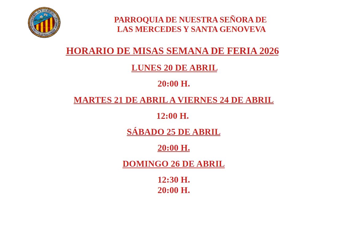 El Domindo día 19 de abril se suprime la misa de 11:00 h. quedando el horario de misas de ese día como sigue: 12:30 h. y 20:30 h